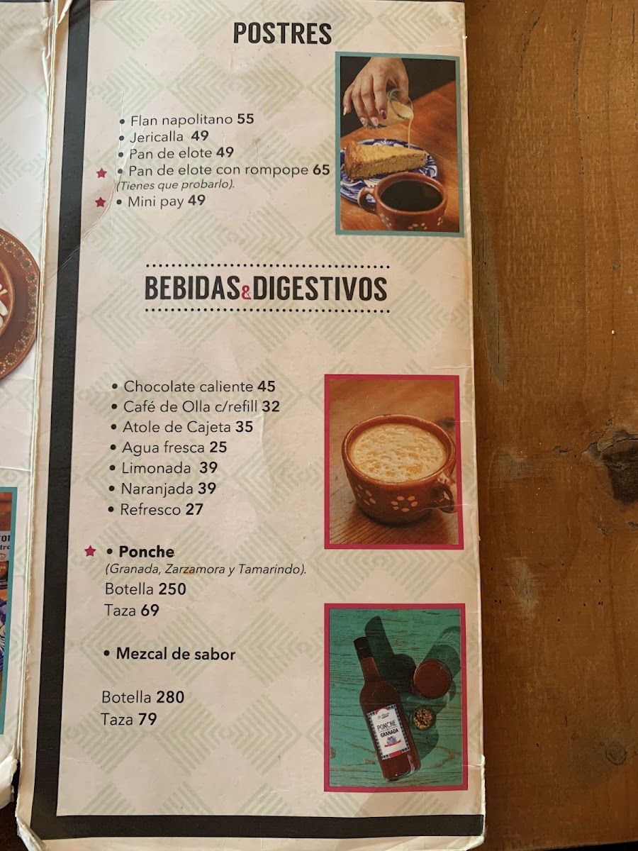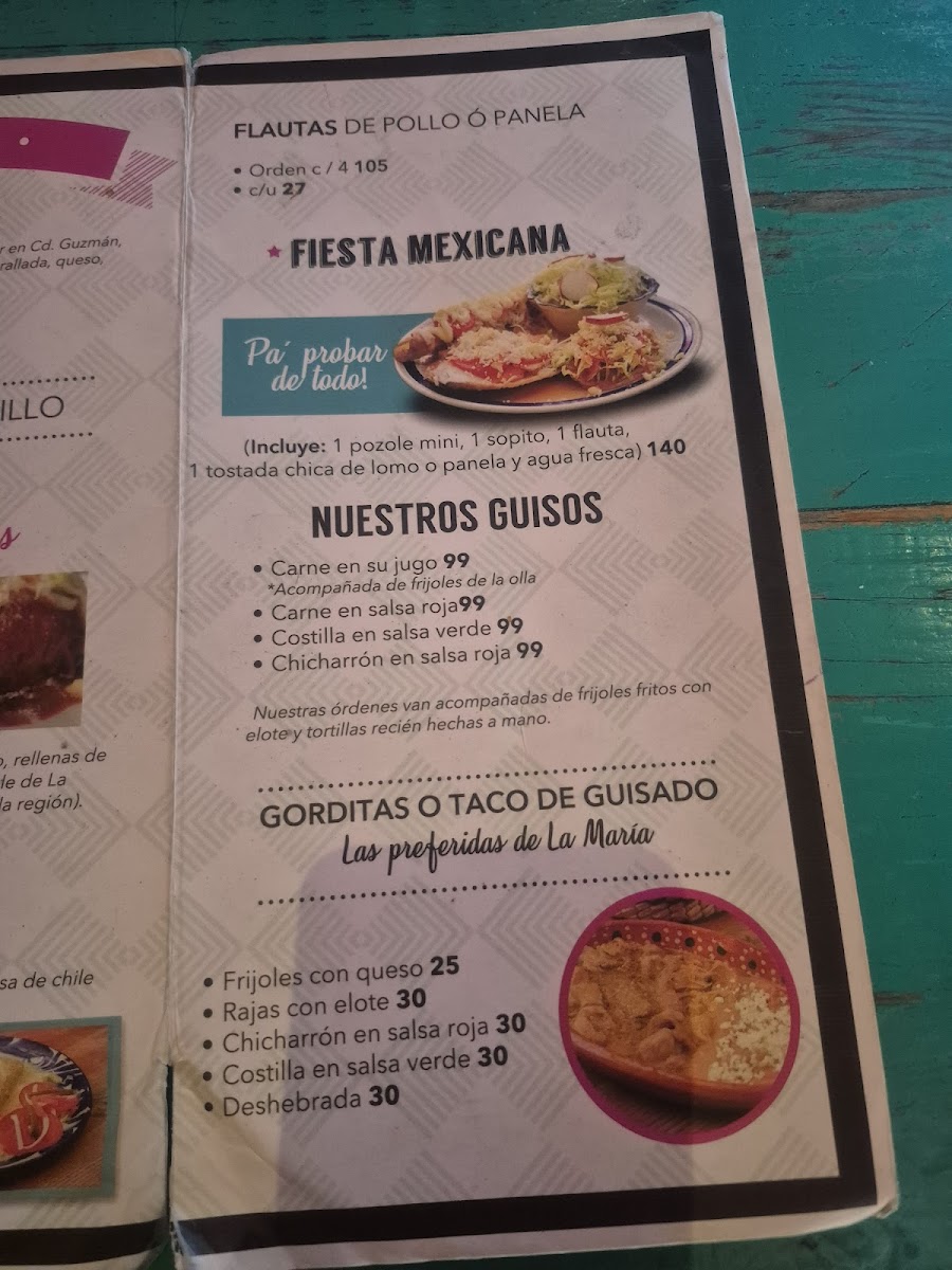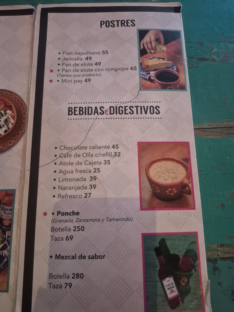Alongside main courses, the menu includes lighter dishes and snacks such as flautas de pollo, gorditas de rajas con queso, and molletes dulces. There is also a range of traditional beverages available, including café, café de olla, atole de cajeta, agua fresca del día, and beer, including options like cerveza Colombo.
