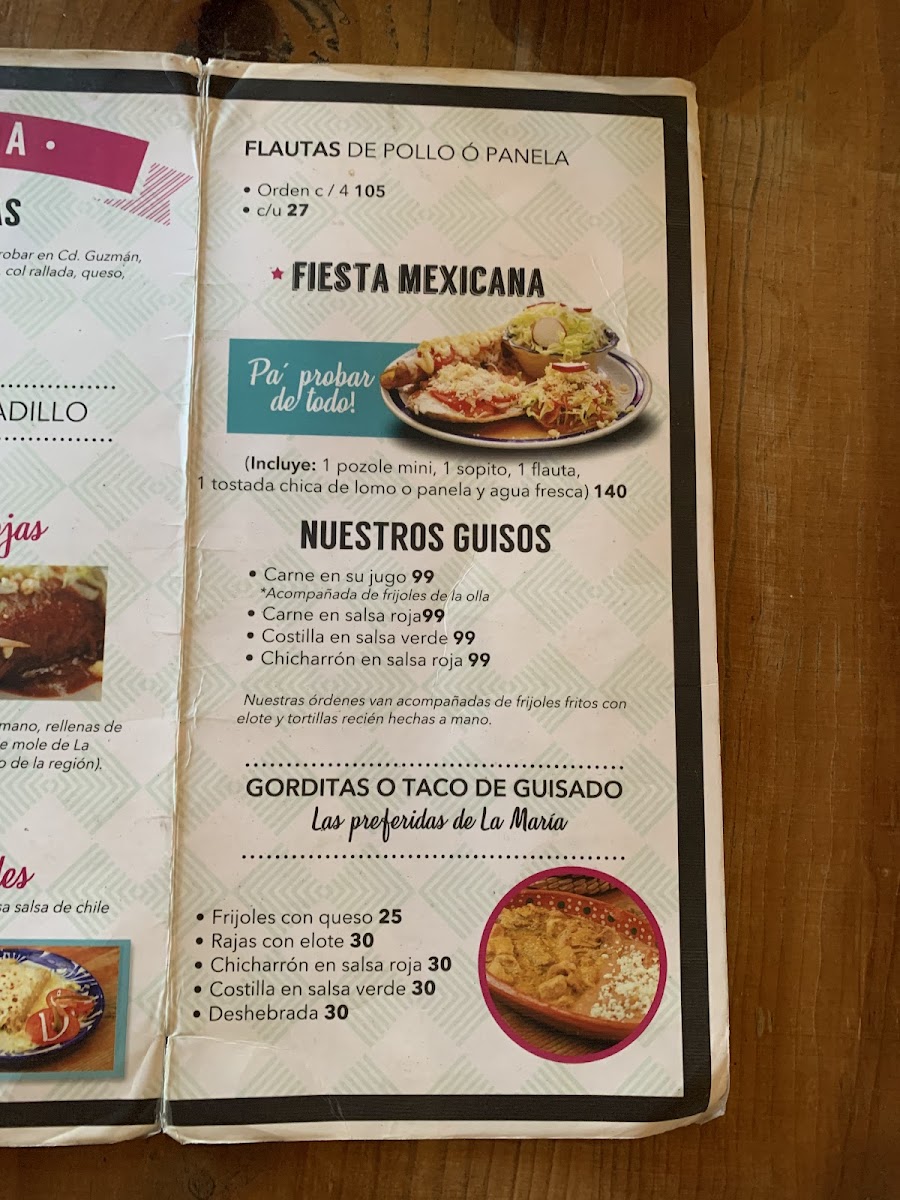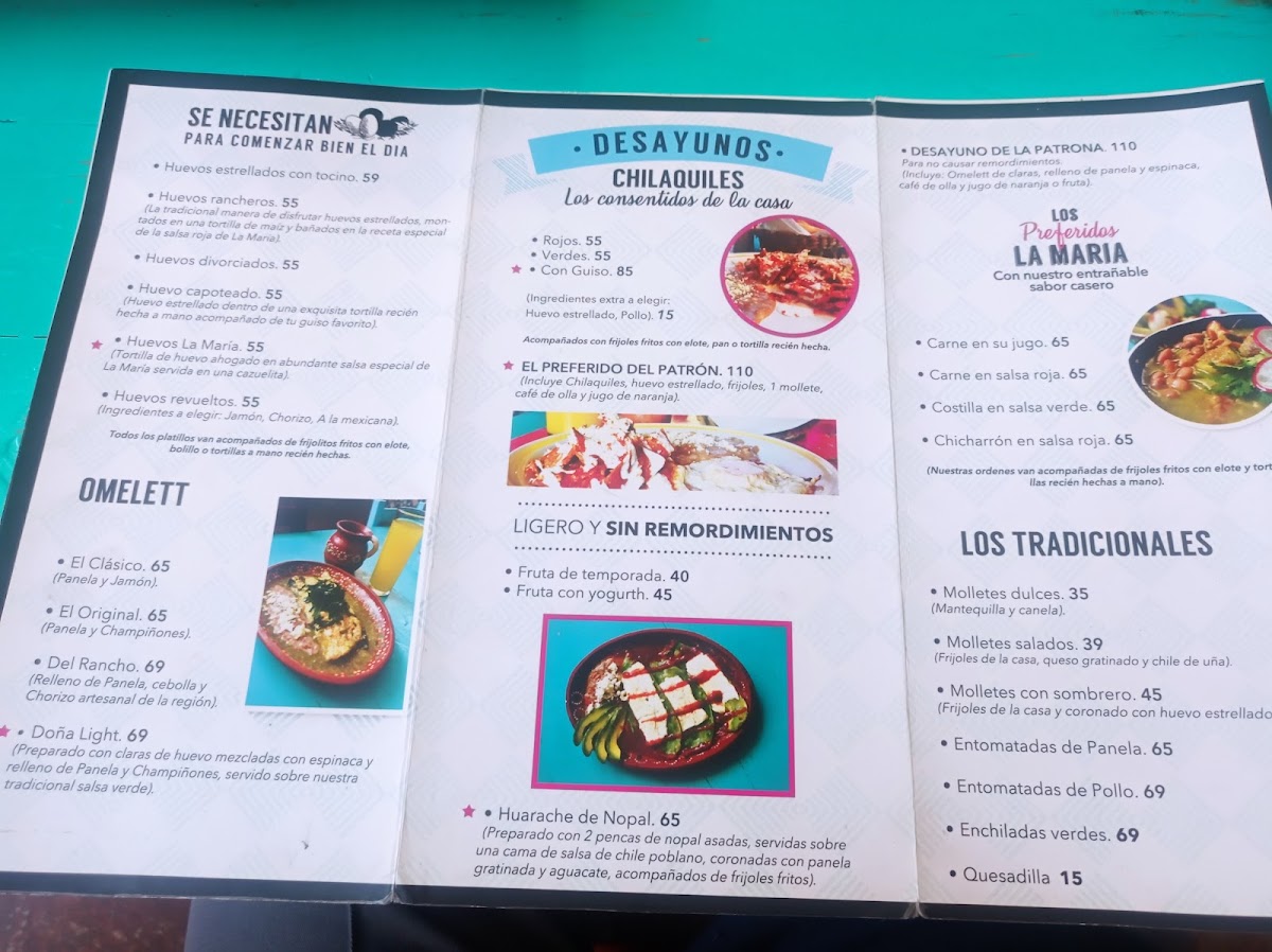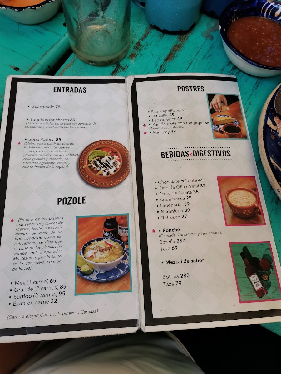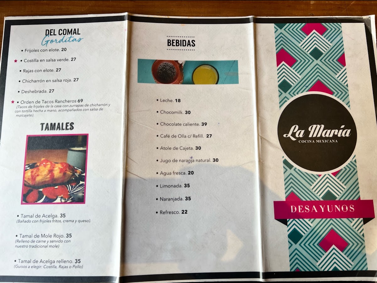 Alongside main courses, the menu includes lighter dishes and snacks such as flautas de pollo, gorditas de rajas con queso, and molletes dulces. There is also a range of traditional beverages available, including café, café de olla, atole de cajeta, agua fresca del día, and beer, including options like cerveza Colombo.
