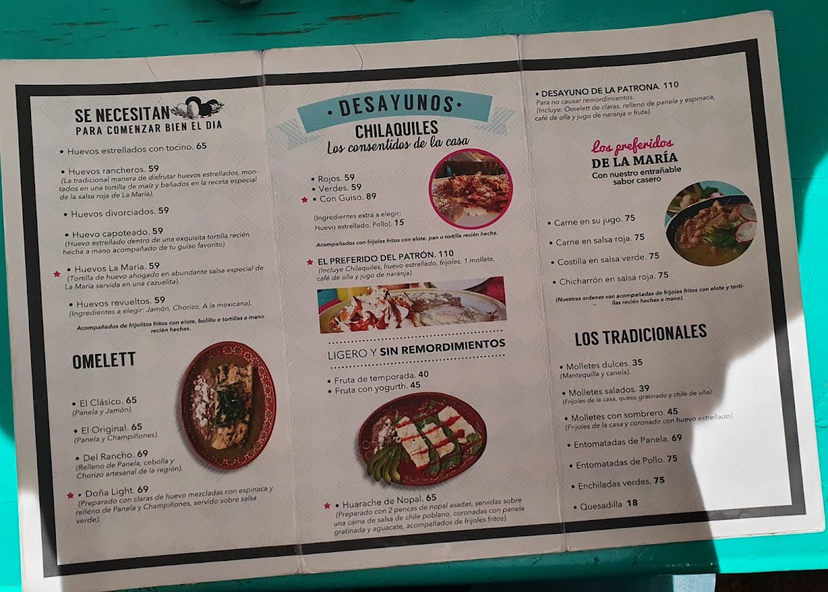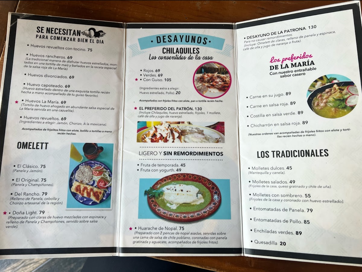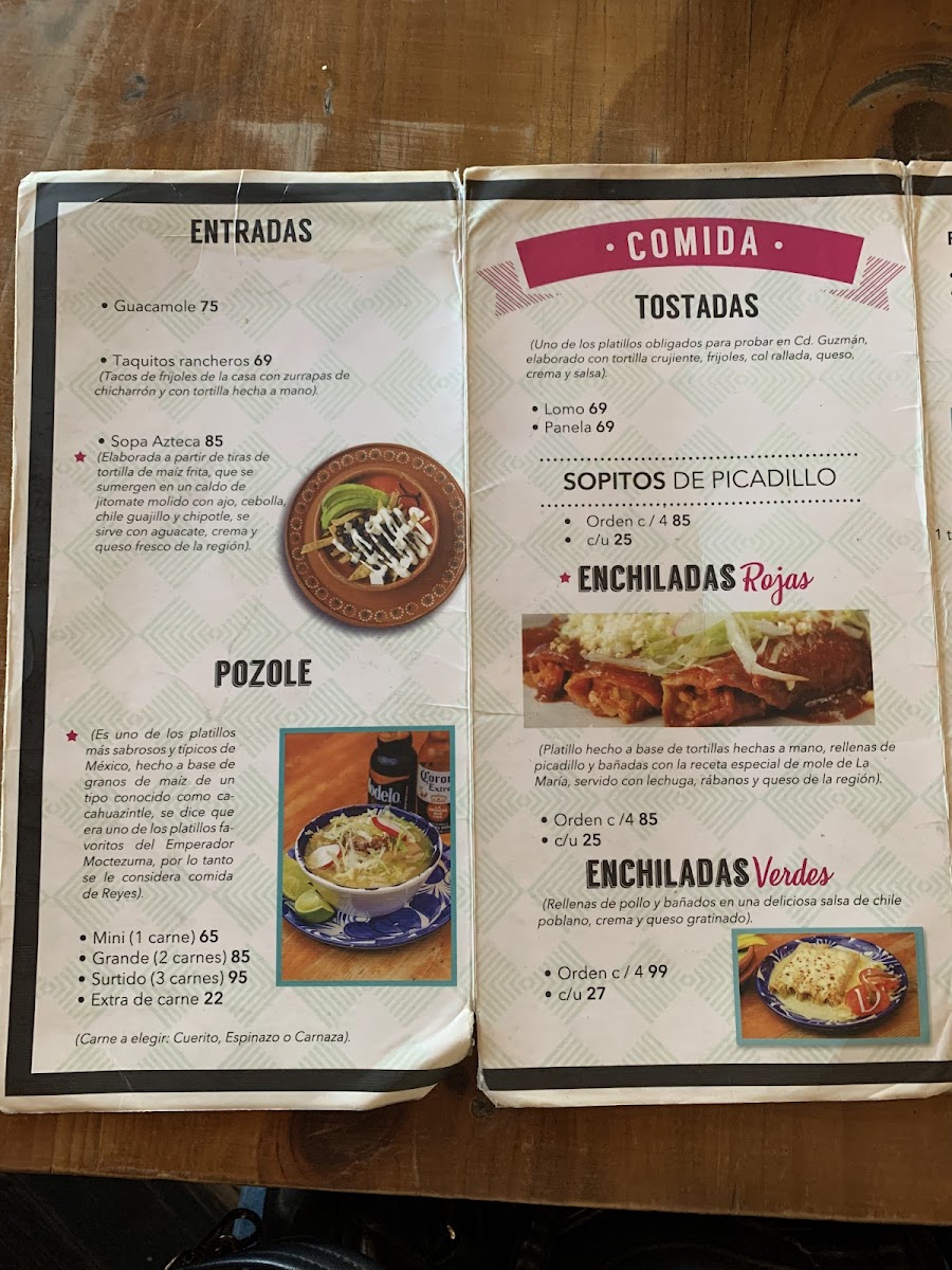 The menu offers a variety of traditional Mexican dishes, suitable for breakfast and lunch. It is organized to include classic breakfast options, a selection of main dishes, and beverages. Visitors can choose from a range of hearty meals such as pozole, enchiladas (including verdes and suizas), and various egg-based dishes like chilaquiles verdes with egg and huevos con jamón.